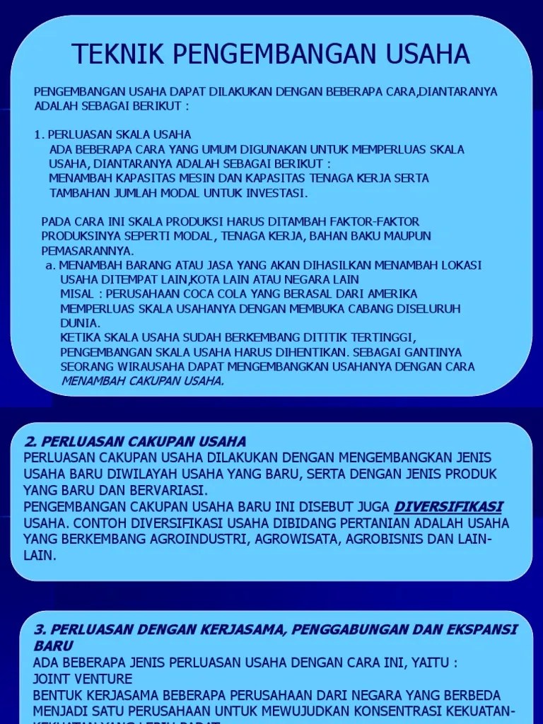 Umumnya, dalam mengembangkan usahanya para pengusaha dituntut untuk bisa melihat peluang yang orang lain tak bisa melihatnya, tak bisa mengambil peluang, mengawali dan menjalankan usahanya dengan baik. Pengembangan usaha yaitu semua usaha dalam membenahi implementasi kerja baik sekarang ataupun kemudian hari dengan cara menyampaikan informasi yang dapat mempengaruhi sikap juga kemampuan. Dec 31, 2018 · teknik pengembangan usaha. Pengertian pengembangan usaha ialah kegiatan penyediaan barang/jasa yang dibutuhkan konsumen yang mempunyai badan usaha ataupun perorangan yang tak mempunyai badan hukum ataupun badan usaha seperti pedagang kaki lima. May 03, 2019 · teknik pengembangan usaha untuk perusahaan yang baru berdiri dan perusahaan yang sudah ada adalah salah satunya ialah memperluas skala usaha , memperluas cakupan usaha, melakukan kerja sama, penggabungan dan ekspansi usaha.